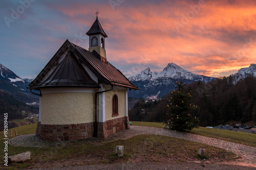 Fototapeta premium Kirchleitn Kapelle am Lockstein in Berchtesgaden im Sonnenuntergang