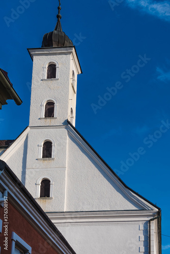 © driendl, Fototapeta premium Kirchturm in Grein an der Dona