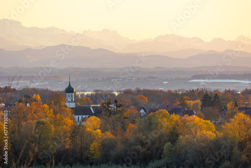 Obraz premium Kirchturm vor Alpenpanorama im Herbst, Kluftern, Deutschland