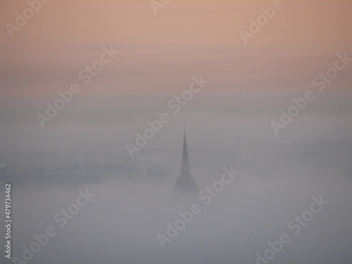 Fototapeta premium Kirchturm zu Hildesheim im Nebel