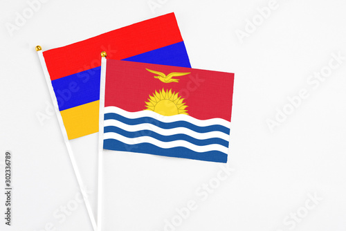 © sezerozger, Naklejka premium Kiribati and Armenia stick flags on white background. High quality fabric, miniature national flag. Peaceful global concept.White floor for copy space.