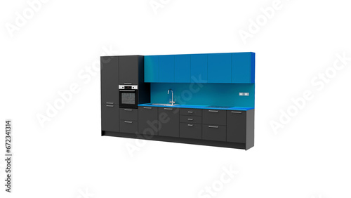Obraz premium KITCHEN DESIGN 3D RENDERING MODEL ISOLATED ON WHITE. DARK GREY AND BLUE KITCHEN PERSPECTIVE VIEW PNG TRANSPARENT