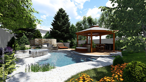 © CreativeCreations, Fototapeta premium Kitchen, Gazebo, and Freeform Pool in the Backyard Design