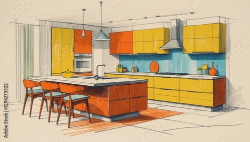 © PabloStock, Obraz premium Kitchen interior drawing. Orange and yellow cabinets, island, chairs. Ink sketch style, bright colors.