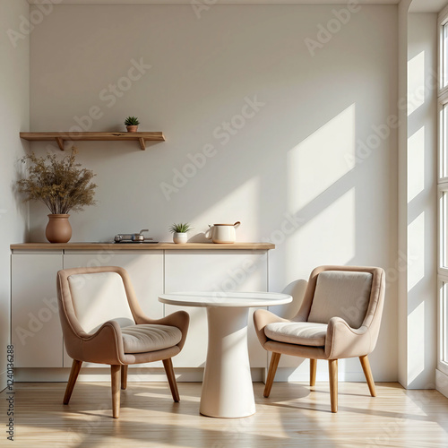 Fototapeta premium kitchen interior in light colors, 2 chairs and a round table in the center