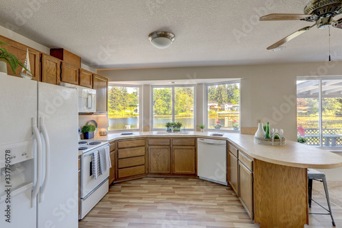 © Iriana Shiyan, Fototapeta premium Kitchen interior with older cabinets in American classic lake front rambler house with low ceiling and hardwood floor.