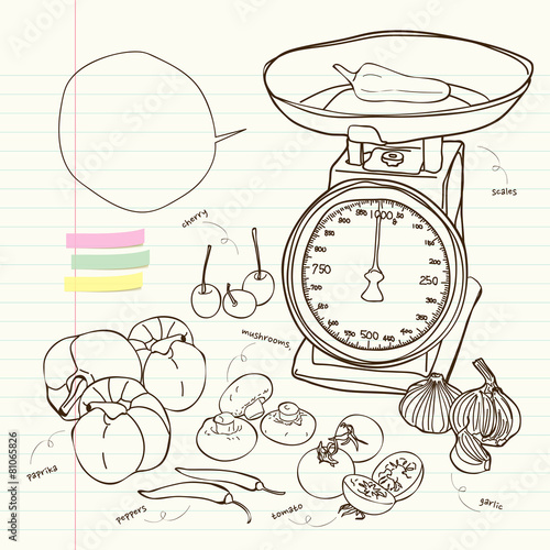 © seesawname, Naklejka premium kitchen scale and vegetables
