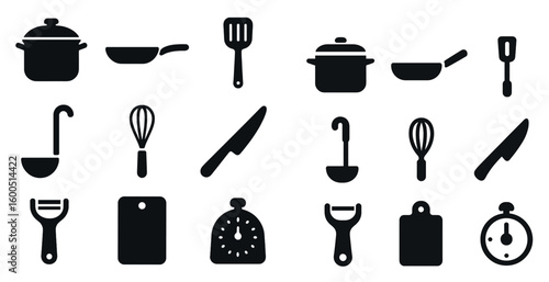 Fototapeta premium Kitchen tools silhouette icons set – solid, filled, cooking and utensil symbols