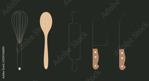 © @KaeDA, Fototapeta premium Kitchen utensils outline set on dark background