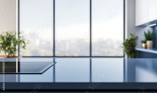 © Five Million Stock, Fototapeta premium Kitchen with an empty blue countertop against a blurred background of a modern interior. Tabletop for product presentation. Clean mockup for food or laundry detergent, washing.
