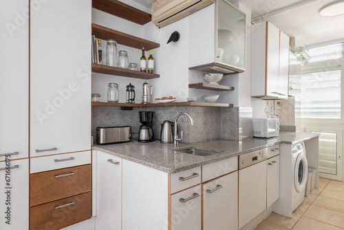 © Pavel, Fototapeta premium Kitchen with cabinets, sink and washing machine in flat
