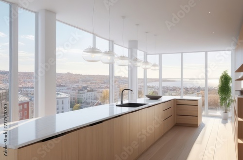 Fototapeta premium Kitchen with wide angle view of a vibrant city in the windows, interior architecture, rendered in octane