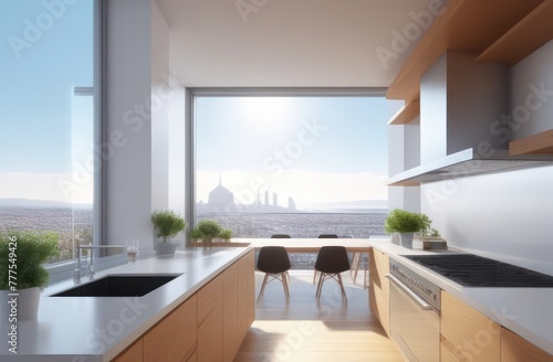 Fototapeta premium Kitchen with wide angle view of a vibrant city in the windows, interior architecture, rendered in octane