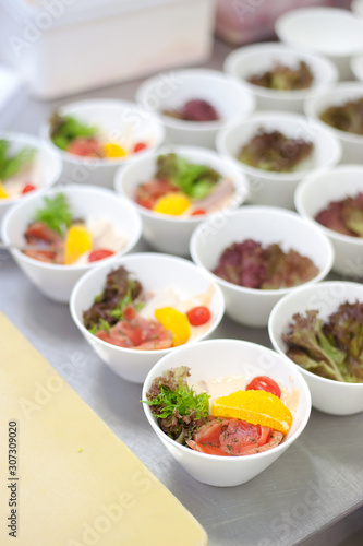 Fototapeta premium Kitchen work - sliced salman and fruit in cups