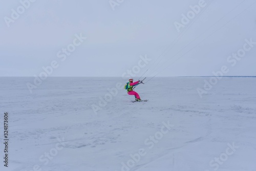 Naklejka premium Kite surfer ride on snowboard. Snowkiting in the snow on frozen lake.