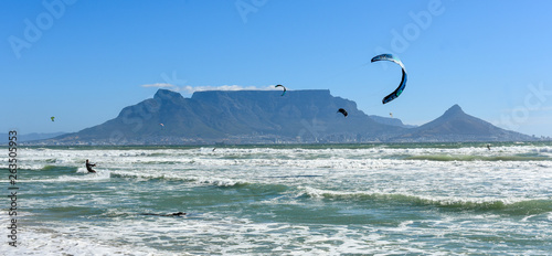 Obraz premium Kite surfing is a popular sports in Cape Town Beaches, South Africa