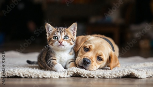 Naklejka premium Kitten and puppy lying together on a soft rug indoors