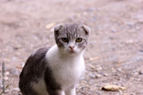 Fototapeta premium Kitten grey white lop-eared with sad eyes in nature. Portrait.