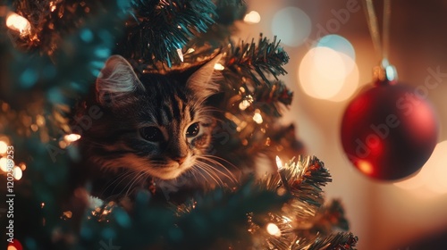 © subur, Obraz premium Kitten Hiding in Christmas Tree