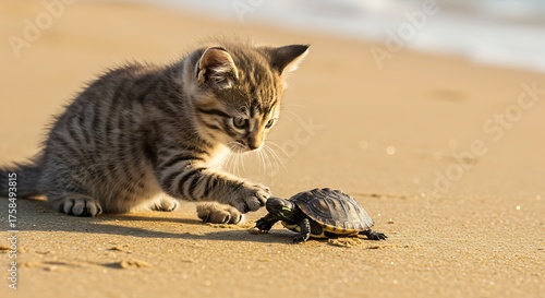 © Naga, Obraz premium Kitten interacting with turtle on sandy beach in bright sunlight