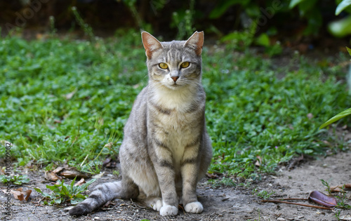 © oralz, Naklejka premium Kitten isolated on green grass, Cat standing