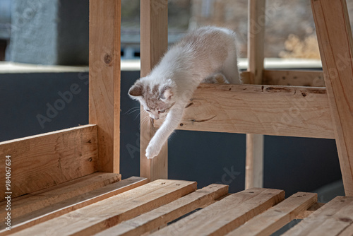 © EMILIA, Obraz premium Kitten trying to jump a step