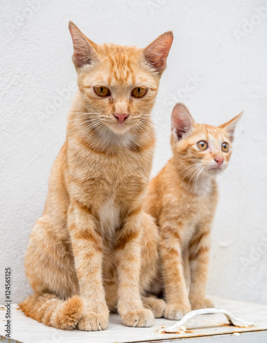 © jeafish, Fototapeta premium Kitten with its mother in outdoor backyard