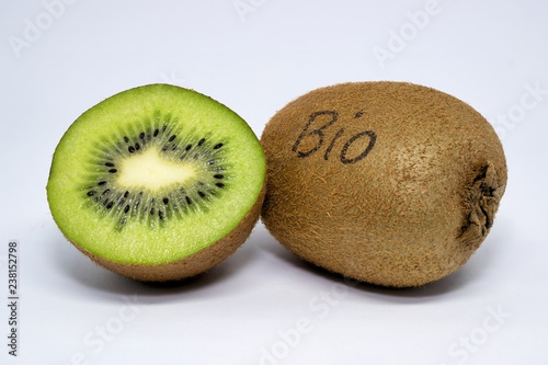 © KraPhoto, Obraz premium Kiwi in Nahaufnahme, mit einer Laser-Kennzeichnung als Bio. Makrofotografie mit Fokus Stacking.