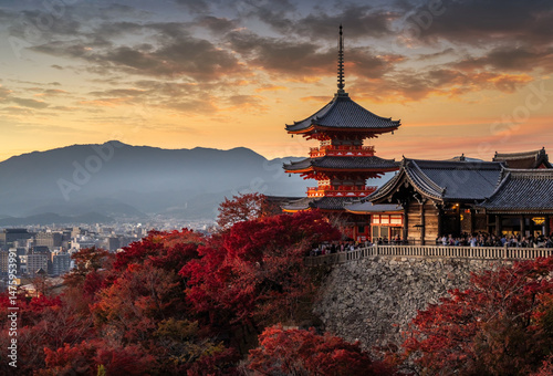 © Travel mania, Fototapeta premium Kiyomizu Dera Pagoda Temple with red maple leaves or fall foliage in autumn season. Colorful trees, Kyoto, Japan