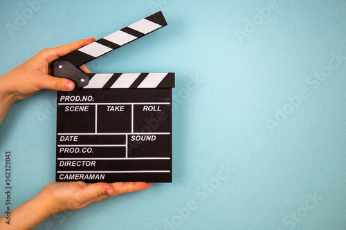 © HappyLenses, Obraz premium Klakier filmu na niebieskim tle, koncepcja kina