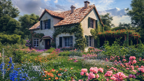Naklejka premium Klasyczny dom, którego elewacja utrzymana jest w ciepłych odcieniach beżu i bieli. Wokół niego znajduje się urokliwy ogród kwiatowy, wypełniony kolorowymi roślinami.