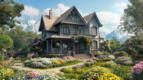 © Sawyer0, Fototapeta premium Klasyczny dom, którego elewacja utrzymana jest w ciepłych odcieniach beżu i bieli. Wokół niego znajduje się urokliwy ogród kwiatowy, wypełniony kolorowymi roślinami.