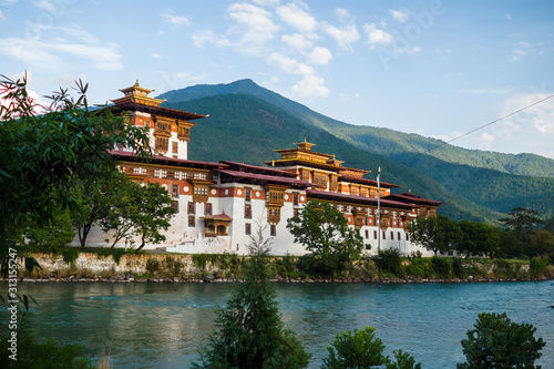 © Raimond Klavins, Naklejka premium Klasztor Dzong w górach Bhutan Himalaje