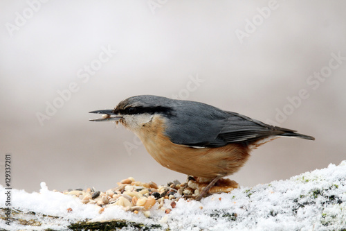 © nightsphotos, Obraz premium Kleiber am winterlichen Futterplatz