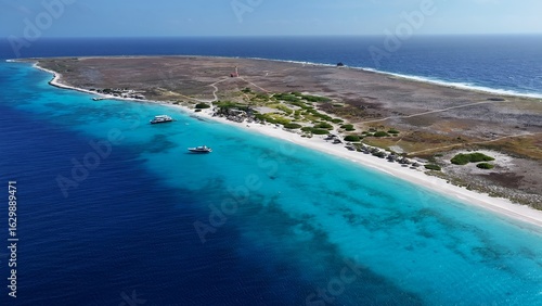 © bydronevideos, Fototapeta premium Klein Curacao Beach In Willemstad Netherlands Curacao. Bird Eye View Of A Amazing Coastal Beach In The Summer Holiday. Shore Sky Clouds Beach Sea. Seaside Panorama. Willemstad Netherlands.