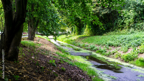 © hhandi77, Naklejka premium kleiner Bach umgeben von Bäumen in einem Stendaler Park während des Sommers