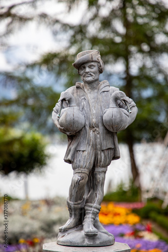 © Fotomaercu, Fototapeta premium kleiner Nachtwächter Zinn Figur mitten im Schlossgarten in Blumenfeld altes Schloss