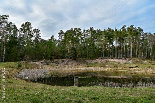 Fototapeta premium Kleiner See mit Bäumen in der Lüneburger Heide bei Wilsede am Wilseder Berg,...