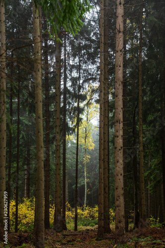 © ohenze, Obraz premium Kleines helles Bäuchen ragt aus dem dunklen Nadelwald heraus