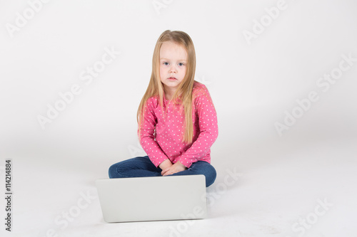 © Timo Blaschke, Naklejka premium Kleines Mädchen / Heranwachsende sitzt frontal vor Laptop