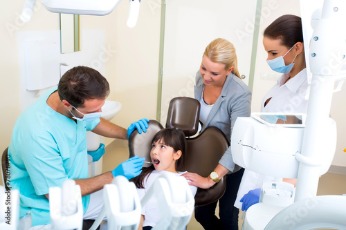 Fototapeta premium Kleines Mädchen mit ihrer Mutter beim Zahnarzt