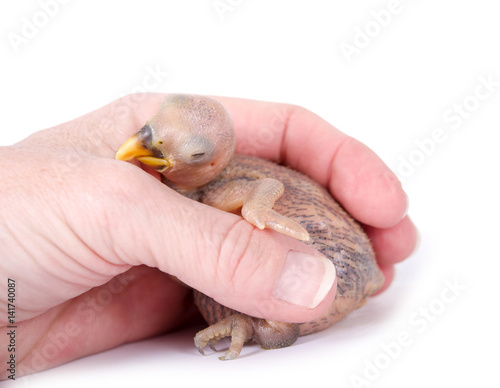 © grafikplusfoto, Fototapeta premium Kleines Papageienküken, 9 Tage alt, kuschelt sich in Hand