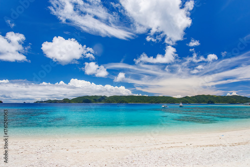 Obraz premium パラソルが並ぶ安室島の白砂のビーチ。 美しいサンゴ礁と熱帯魚の群れ。 安室島沖縄県 島尻郡慶良間諸島座間味島-2025 サンゴの産卵があり卵が漂う。沖縄本島から40km西方の諸島。30以上の島嶼群全体が国立公園に指定。珊瑚礁の青い海と白い砂浜は世界屈指の美。貴重な動植物が多数生息。
