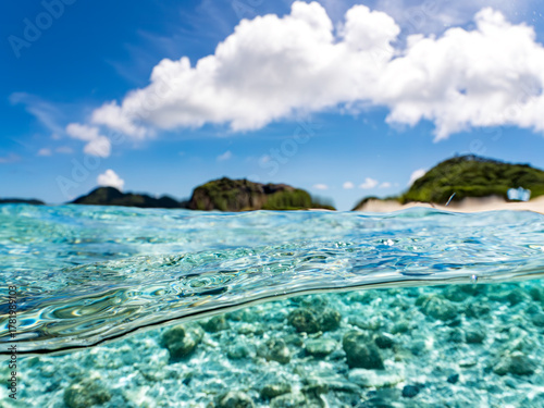 Fototapeta premium 嘉比島の白砂ビーチの半水面撮影。沖縄特有の双胴船サバニや観光客、パラソル、テントが見える。美しいサンゴ礁と熱帯魚の群れ。 安室島沖縄県...