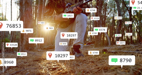 Fototapeta premium Kneeling tactical operative scanning forest floor in pine woods, with rifle and data overlays