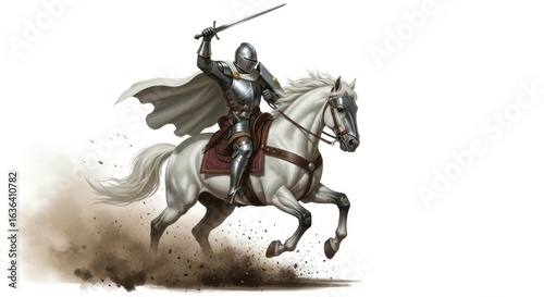 © Moslema, Fototapeta premium Knight in Shining Armor Riding Majestic White Horse Victorious Charge