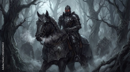 © ARTSPRIO, Fototapeta premium Knight on a horse in a forest with smoke coming out of his mouth