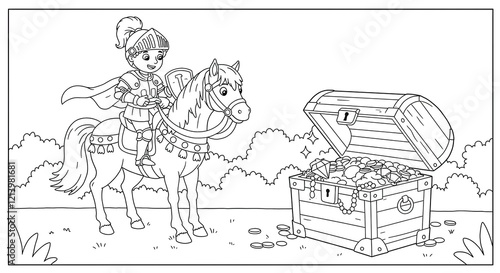 Fototapeta premium Knight on Horseback Discovering Treasure Chest - Black and White Line Art for...