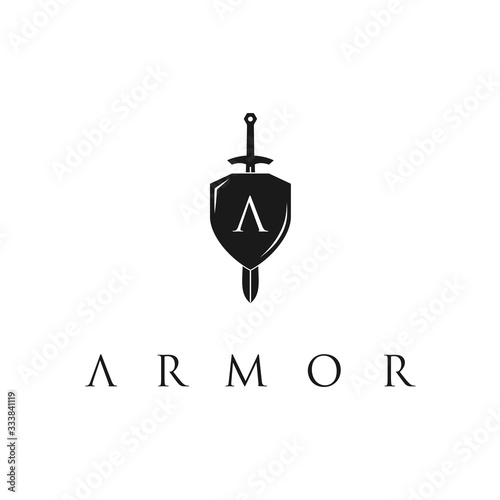 Obraz premium Knight Shield Armor Sword with Initial Letter A logo design template