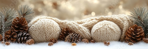 © Ika, Naklejka premium Knit yarn, pine cones, winter scene, bokeh background; holiday craft